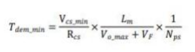 其中,Vcs_min为原边PWMIC过流保护最小阈值, Rcs为原边采样电阻,Lm为变压器激磁电感感量,Vo_max为最大输出电压,VF为同步整流压降(取0.2V),Nps为变压器匝比。系统上测试最小续流时间Tdem_min的条件为: