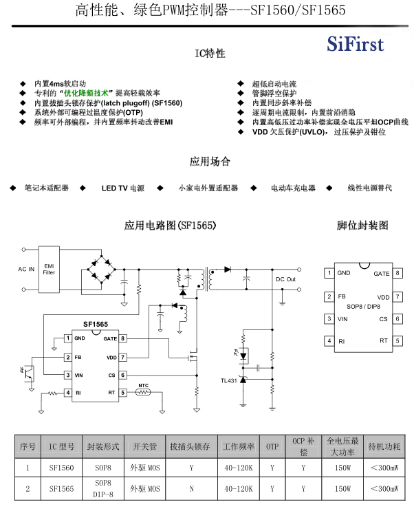 | SF1530 | 副边反馈/外驱MOSFET | 外置MOSFET | / | <300 | 50W | 可调 | 19V 2.1A | SOT23-6 |