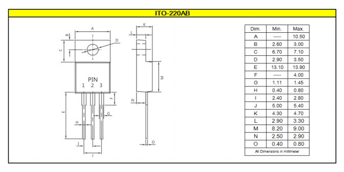 | PFR30L60CTF | MOS Schottky | L | 2 | 30 | 60 | 0.6 | 500 | 0.56 | 100 | ITO-220AB | 250 | -65~150 |